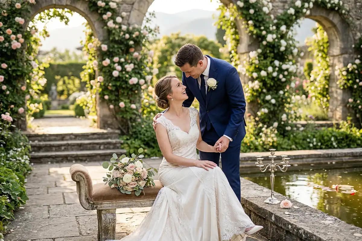 A classic gesture brings instant romance to your session. Here, the groom gently lifts his bride’s hand to his lips. He keeps his eyes down, focusing entirely on this small act of devotion. Her gaze meets his with a soft, affectionate smile, creating a beautiful silent connection.
